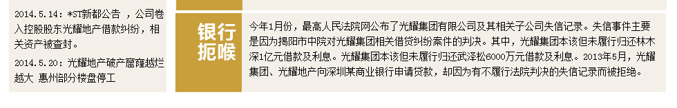 興潤崩盤,曾被媒體評論為“推倒了2014年中小房企崩盤的第一張多米諾骨牌”。隨后,資金鏈斷裂、房企破產、項目爛尾等聲音此起彼伏,這些案例中,最令市場關注的,莫過于近日瘋傳的“光耀地產資金鏈斷裂”事件。5月7日光耀地產公開發表聲明,承認公司面臨資金鏈問題,但否認了瀕臨破產的說法,之后也表示愿意接受其他企業的收購。 |