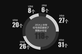 2014年上半年,共有118個住宅項目拿到了預(yù)售許可證。批準銷售總套數(shù)為38363套,已銷售套數(shù)為11146套。其整體月均去化率為13.64%。