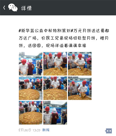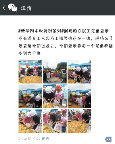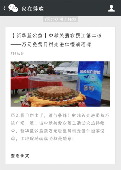 為了給這些身在異鄉的農民工兄弟送去溫暖,新華藍公益特別為他們舉辦了一場“中秋關愛農民工特別活動”,現場為工人捐贈月餅。8月29日上午10:30,本次活動在成都沙灣會展中心如期啟動。