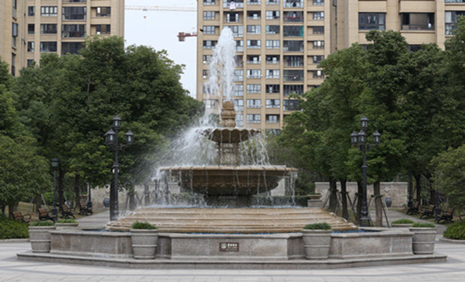 小區(qū)內(nèi)綠化布置以生態(tài)、綠色為先導(dǎo),充分利用其樓間距的距離,形成縱深交錯,層層合圍的平面布局。一路走來,花卉植物、雕像噴泉、卵石路徑,滿目皆是。