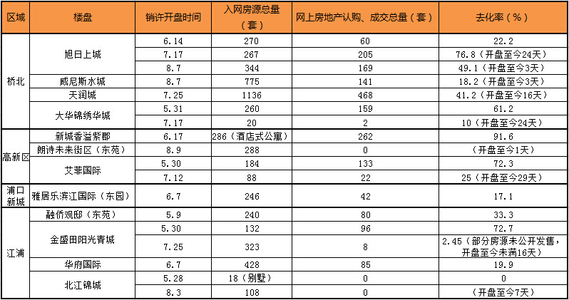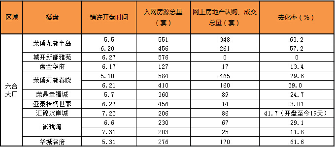 新華網記者將目前六合、大廠區域在售的9家熱點樓盤,5、6、7三個月內的12次開盤納入統計范疇,結果發現,其中6家樓盤的7次推售,已持續一個月時間,但去化率不足50%。[詳細]