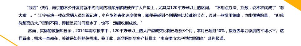 新華網(wǎng)記者通過(guò)跟蹤近期南京大戶型市場(chǎng)的供銷情況,發(fā)現(xiàn)是“幾家歡喜幾家愁”。調(diào)查顯示,誠(chéng)如城中、河西、甚至仙林,這些單價(jià)動(dòng)輒每平方米兩、三萬(wàn)元的片區(qū),讓購(gòu)房者買一套單身公寓都頗感吃力,更別提120平方米以上的大戶型了。
