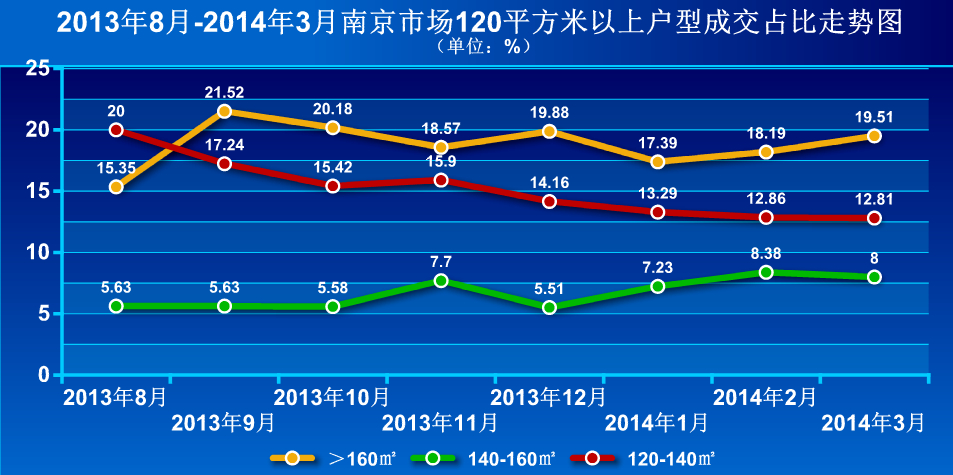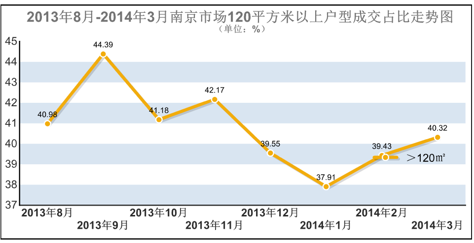 根據(jù)世聯(lián)行獨(dú)家提供的數(shù)據(jù),今年一季度三個(gè)月,南京樓市中戶型建筑面積在120平方米以上的新增商品房成交比例分別達(dá)到了37.91%、39.43%及40.32%。 經(jīng)新華房產(chǎn)記者計(jì)算,三個(gè)月月均以1.2個(gè)百分點(diǎn)增長(zhǎng),平均銷售占比達(dá)39.22%,即“10個(gè)購(gòu)房者中就有4個(gè)選擇了大戶型”。[詳細(xì)]