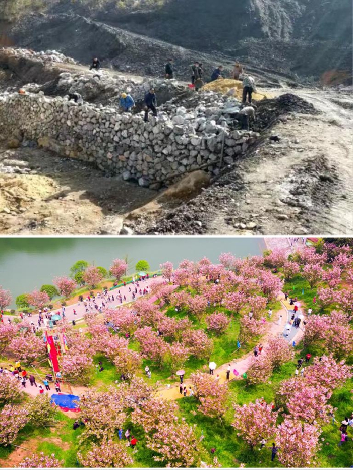 拼版圖片:上圖,安源區(qū)城郊管委會略下村生態(tài)修復(fù)前礦山裸露;下圖,生態(tài)修復(fù)后“陽光花海”景象。(萍鄉(xiāng)市委宣傳部供圖)