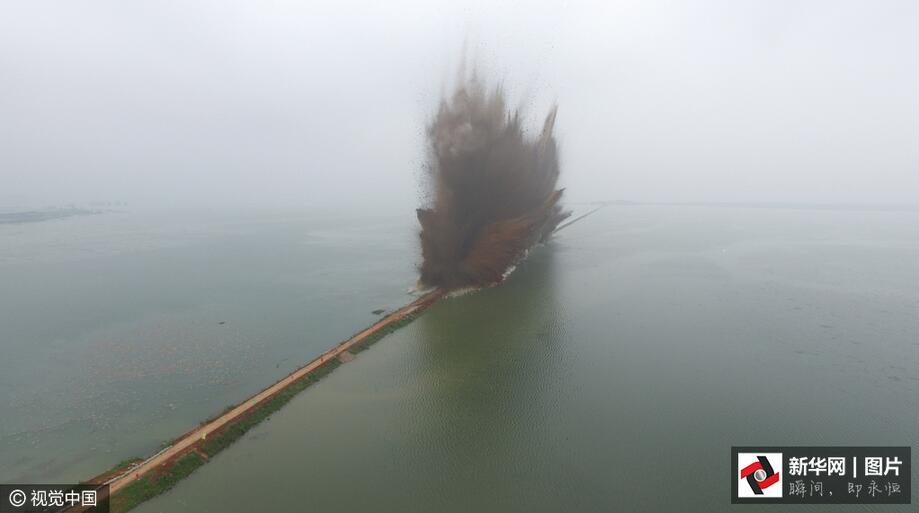 ??? 7月14日7時,伴隨著一聲聲的爆破轟鳴,梁子湖與牛山湖隔堤正式實施爆破作業(yè),這標(biāo)志著湖北梁子湖流域的牛山湖正式破垸分洪。(圖片來源:視覺中國)
