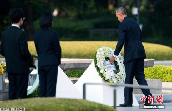 ????資料圖:2016年5月27日,美國總統奧巴馬乘直升機抵達日本廣島和平紀念公園附近,展開對和平紀念公園的訪問并獻上花環。