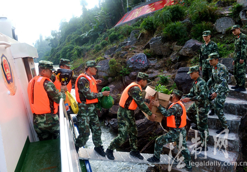 圖為官兵們將日用品用巡邏艇沿湄公河送到第一哨位執勤點
