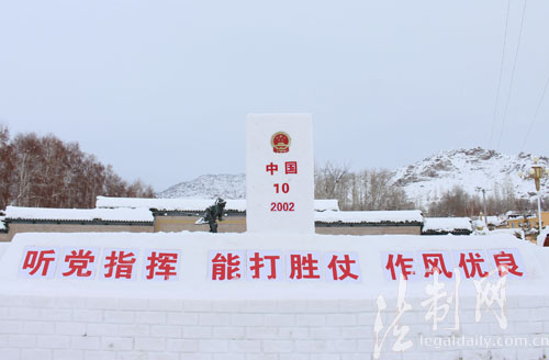 圖為2016年12月29日,新疆阿勒泰邊防支隊汗德尕特邊防派出所官兵完成“聽黨指揮 能打勝仗 作風(fēng)優(yōu)良”雪雕作品