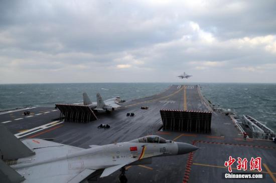 中國海軍航母編隊在南海組織艦載機起降訓練
