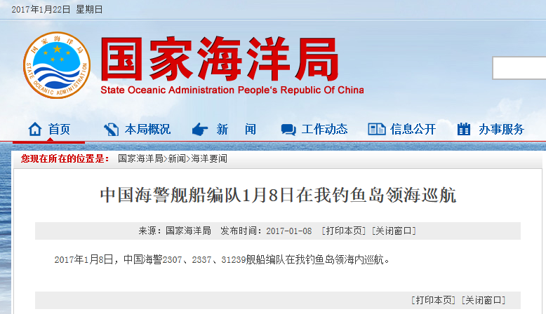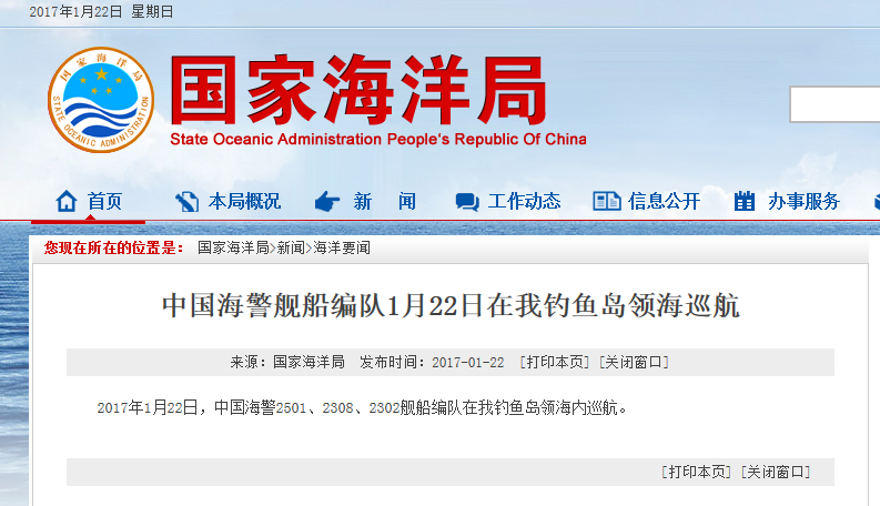 據國家海洋局網站報道,2017年1月22日,中國海警2501、2308、2302艦船編隊在我釣魚島領海內巡航。