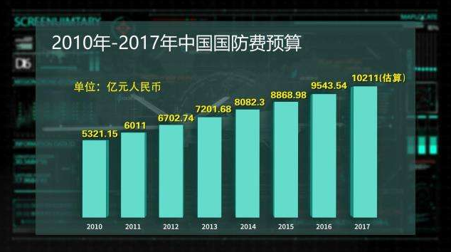 自1999年超過1000億元人民幣,到2017年突破10000億元人民幣,中國的國防實力上了一個新臺階,國防建設(shè)與經(jīng)濟建設(shè)協(xié)調(diào)發(fā)展進入了一個新階段。