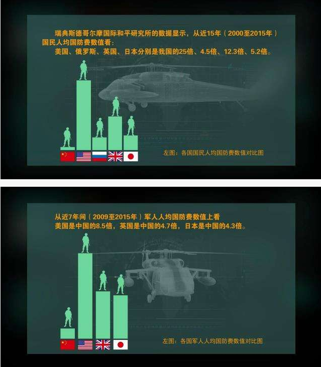 【中國人均國防費為690元人民幣,約104美元】相當(dāng)于美國的1/18、日本的1/4、英國的1/9、法國的1/7、俄羅斯的1/5