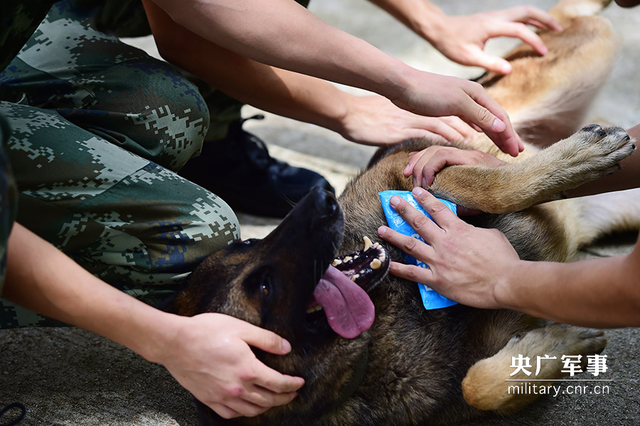 7月12日,警犬剛完成系列軍事訓練,訓導員用冰塊為它防暑降溫。冰塊是訓導員的隨身必帶品。廖鍵攝