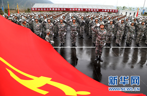 2015年勝利日大閱兵訓練期間,“狼牙山五壯士”英模部隊方隊組織宣誓活動(2015年6月29日攝)。新華社發