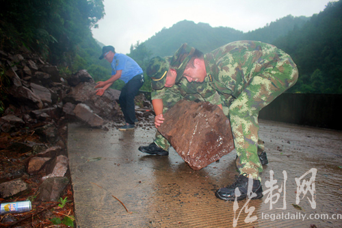 圖為鑒江邊防派出所官兵正齊心協(xié)力轉移落石