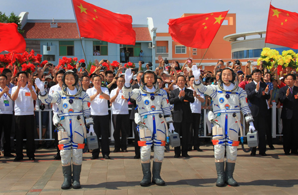 ????2012年6月16日,神舟九號(hào)航天員出征儀式在酒泉衛(wèi)星發(fā)射中心航天員公寓問(wèn)天閣舉行,航天員景海鵬、劉旺、劉洋(從右至左)向歡送人群揮手致意。新華社記者 李剛 攝