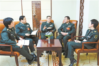 本報(bào)記者鄒維榮(左一)、柴華(右一)采訪軍隊(duì)政協(xié)委員曲新勇、王健、吳剛(左二至左四)。中國(guó)軍網(wǎng)記者 孫智英 攝
