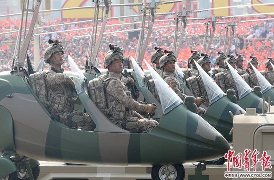 10月1日,慶祝中華人民共和國成立70周年大會上,裝備方隊官兵身著新式迷彩服接受檢閱。中國青年報·中國青年網記者 趙迪/攝