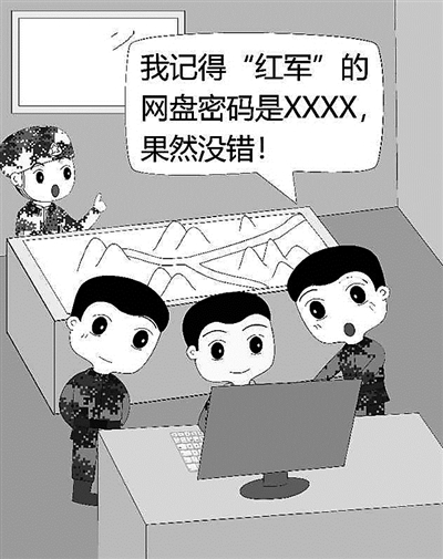 ????演練結束,這名文書坦言,他早就知道對方的網盤密碼。原來,此前,各營文書為了便于工作交流,有時會使用網盤傳輸或分享文件,一些網盤用戶名和密碼不少人都知道。這次演練前,“藍軍”營文書在用網盤調取查閱資料時,無意中在對方網盤中發現了秘密。