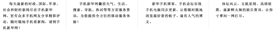 手機新華網(wǎng)是新華網(wǎng)的手機無線門戶網(wǎng)站,是中國最具權(quán)威的免費手機新聞網(wǎng)站之一。歡迎各地電信運營商以及廣告界、企業(yè)界、商務界、傳媒界等各界人士與我們聯(lián)系,精誠合作,實現(xiàn)共贏。電話:010-63070908,E-mail:xhsjb@xinhuanet.com