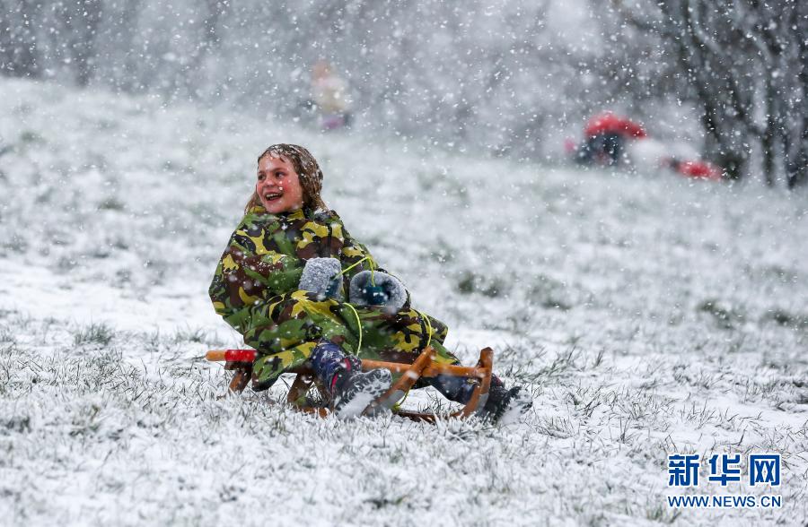 1月24日,一名女孩在英國(guó)倫敦的大雪中滑雪橇。新華社記者韓巖攝