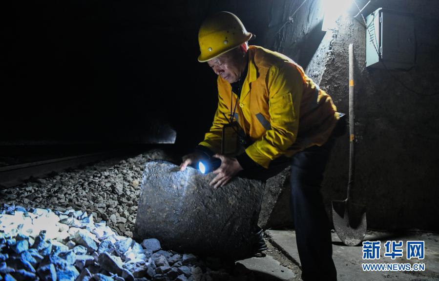 在廣西河池境內(nèi)黔桂鐵路線上的鄧山隧道,中國鐵路南寧局集團(tuán)有限公司柳州工務(wù)段的4名看守工輪換值班,依靠手電筒在黑暗中穿行,及時(shí)巡查隧道中可能出現(xiàn)的各種隱患,確保每天經(jīng)隧道運(yùn)行的59趟客貨列車春運(yùn)安全。鄧山隧道全長773米,是一個(gè)需要人員全天候看守的鐵路隧道。