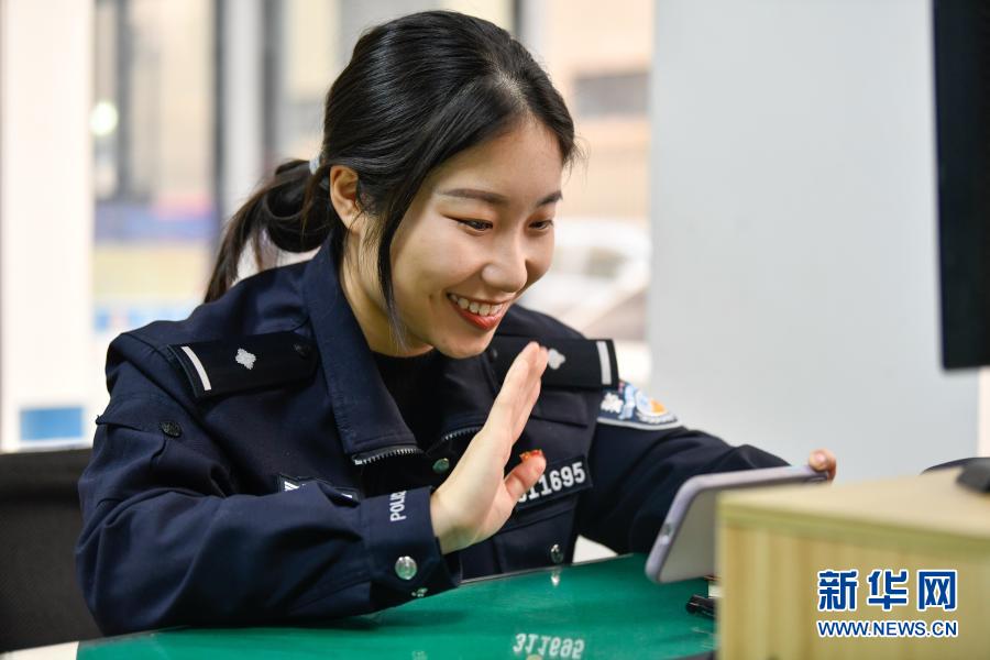 2月11日,在天津市紅橋區芥園派出所,楊曉惠與在河北邯鄲的爺爺奶奶視頻通話。新華社發(孫凡越攝)
