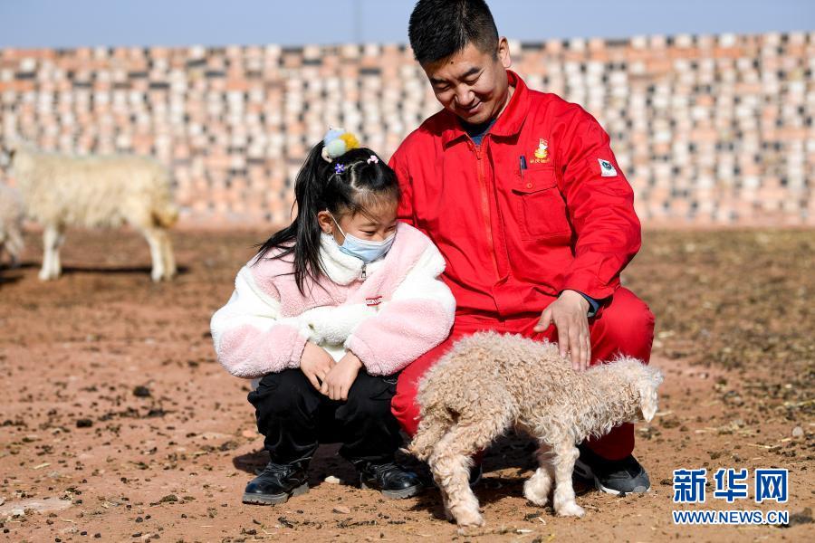 7歲的王思淇第一次來到爸爸王濤駐村的紅井子村,她對一切都充滿了好奇。這是王濤和王思淇在撫摸一只小羊羔(2月11日攝)。