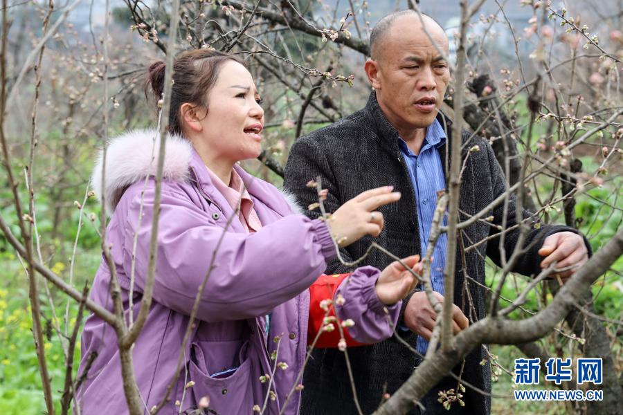 2月13日,吳窮(左)在坪子社區(qū)和種植大戶檢查櫻桃樹(shù)的生長(zhǎng)情況。新華社記者 歐東衢攝