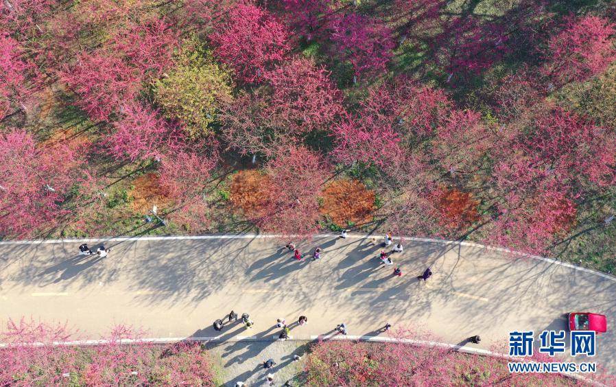 2月14日,游客在湖南省常寧市羅橋鎮櫻花園游玩 (無人機照片) 。新華社發(曹正平 攝)
