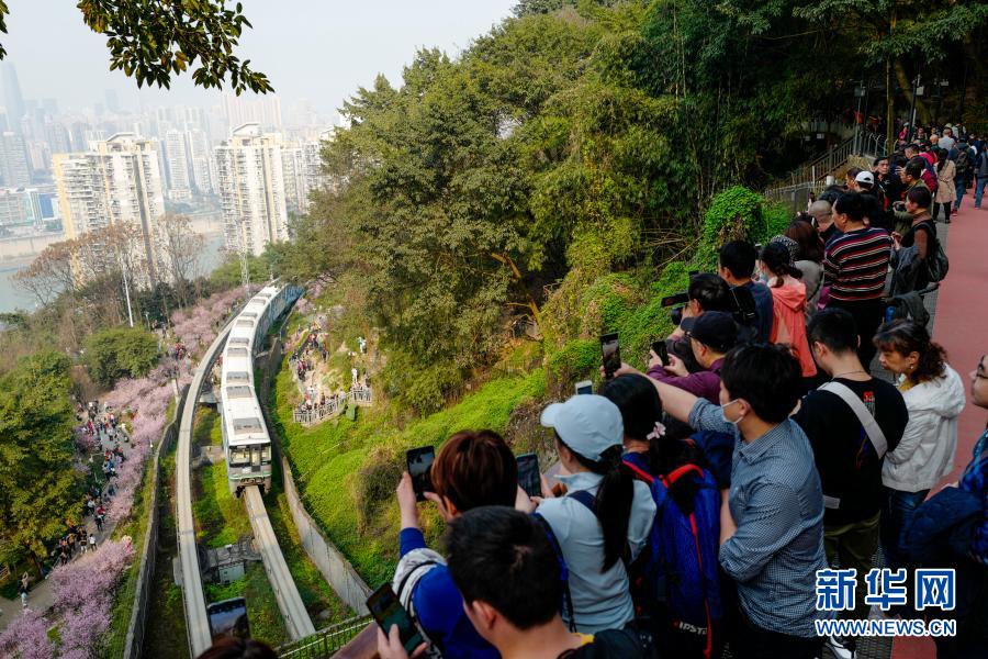 2月23日,在重慶軌道交通2號(hào)線佛圖關(guān)段,游客在山城步道上拍攝穿越花海的單軌列車(chē)。