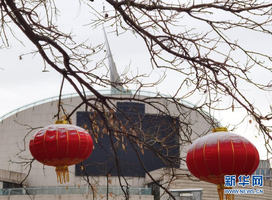 3月1日,在北京中華世紀壇附近,兩只紅燈籠頂部被積雪覆蓋。