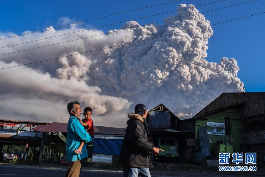3月2日,人們在印度尼西亞北蘇門答臘省卡羅觀看噴發的錫納朋火山。新華社發(森比林攝)
