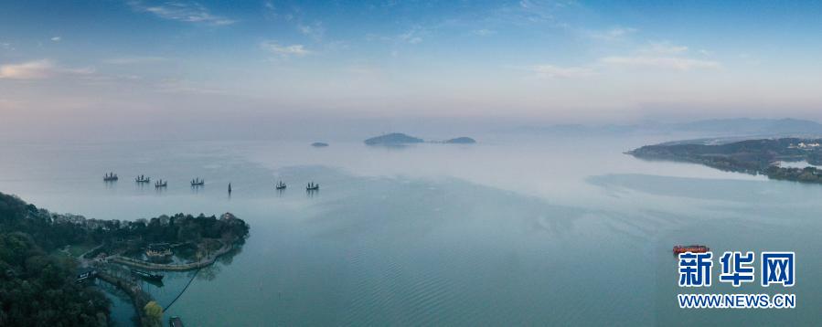 3月13日拍攝的江蘇省無(wú)錫市太湖黿頭渚景區(qū)晨景(無(wú)人機(jī)全景照片)。