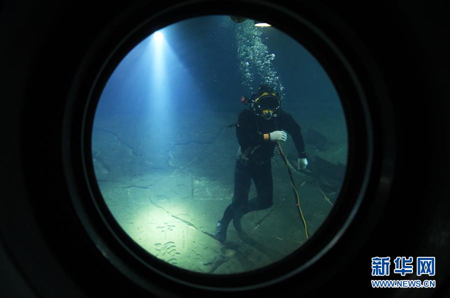 3月15日,在長江水下40多米的白鶴梁題刻無壓容器罩內,潛水員在進行清理作業。新華社記者 王全超 攝
