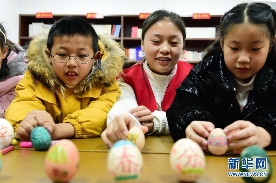 3月20日,在江蘇省鎮(zhèn)江市新金江社區(qū),江蘇大學志愿者和小朋友一起玩“立蛋”游戲。