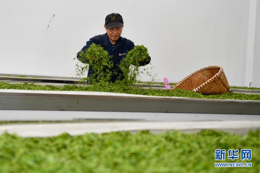 3月20日,余杭區余杭街道竹園村一家茶場的工人在對新采的茶葉攤青。
