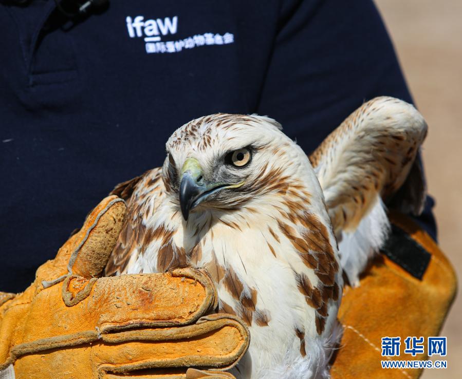 3月20日,北京猛禽救助中心猛禽康復師周蕾準備放飛大鵟。新華社記者 李京 攝