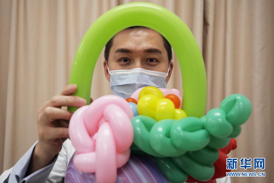 在香港東區醫院,“氣球大夫”陳諾文醫生展示他制作的氣球花籃(3月16日攝)。