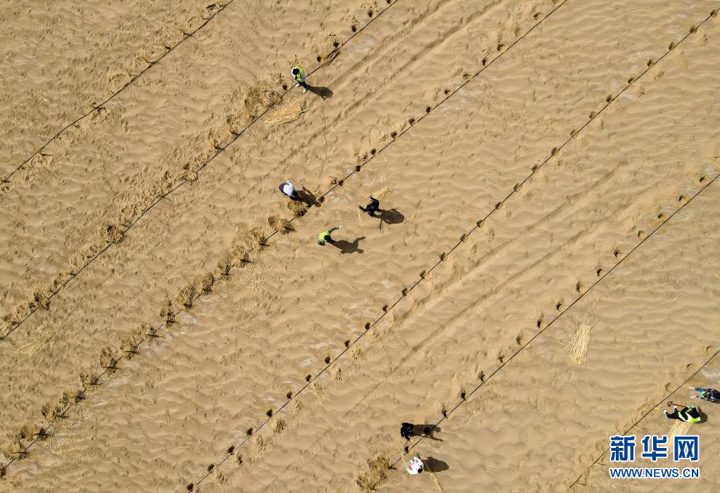 3月28日,人們?cè)谇夷┛h城不遠(yuǎn)處的塔克拉瑪干沙漠內(nèi)植樹(shù)(無(wú)人機(jī)照片)。