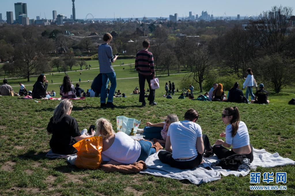 3月29日,人們在英國倫敦的報春花山享受陽光。