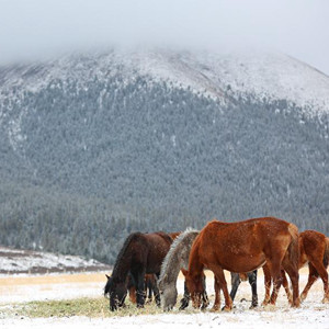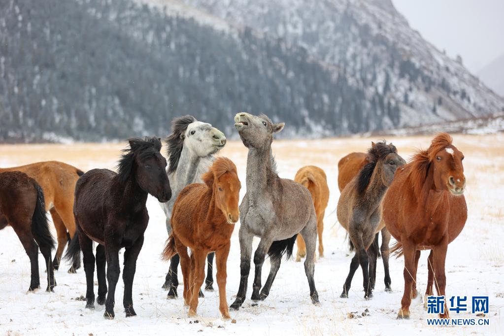 當日,受冷空氣影響,位于甘肅省河西走廊中部、祁連山北麓的山丹馬場降雪,馬群在雪原上奔跑覓食,構成了一幅壯美高原雪景 。