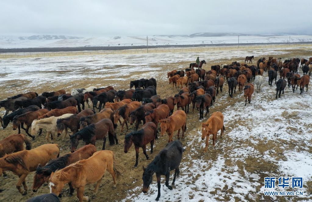 3月31日在山丹馬場拍攝的風雪中的馬群(無人機照片)。