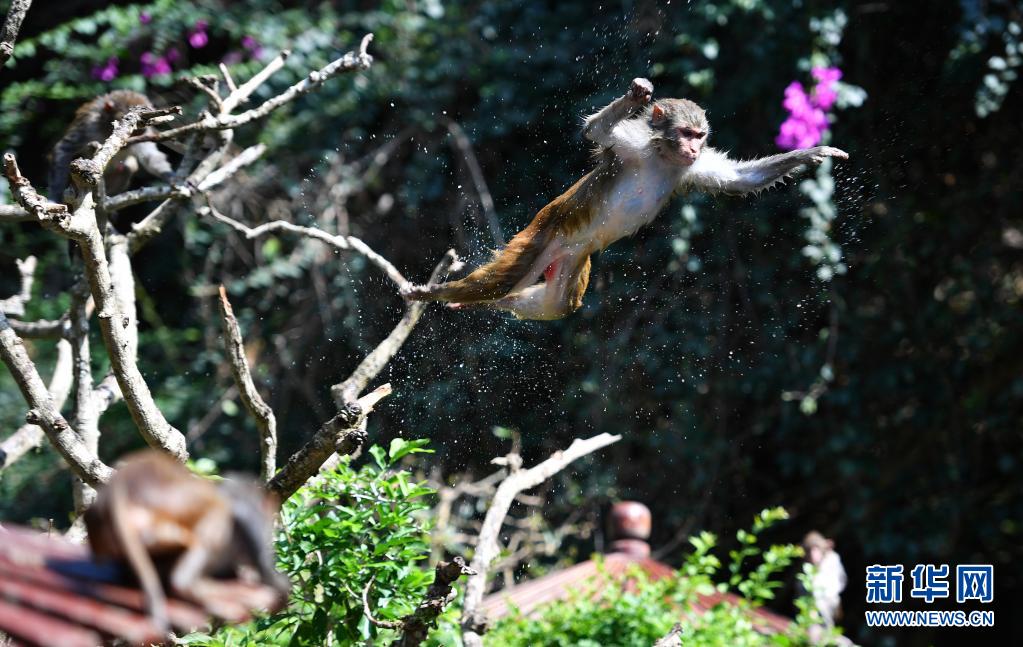 4月4日,獼猴在南灣猴島保護區里跳水。