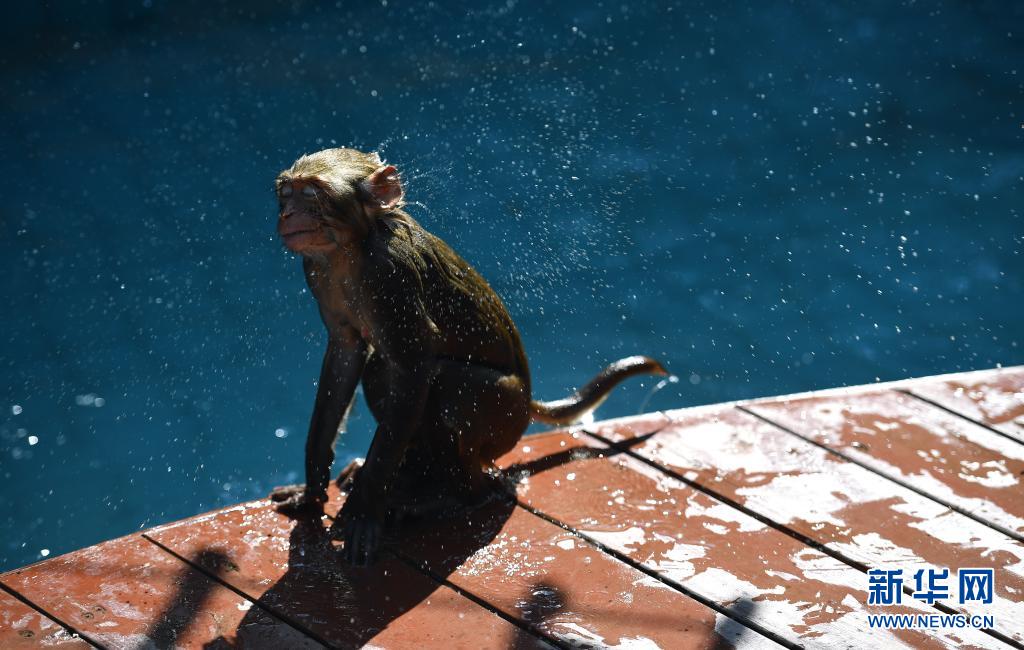 4月4日,南灣猴島保護區里的獼猴在上岸后甩去身上的水。