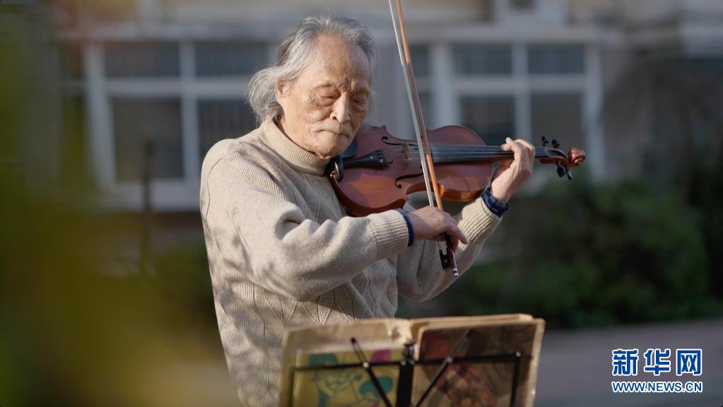 3月24日,“看夕陽(yáng)的老人”王欣在東西湖區(qū)園藝花城小區(qū)內(nèi)拉小提琴。新華社記者 熊琦 攝