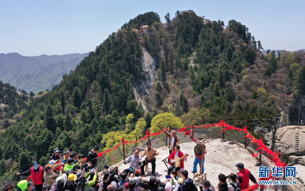 5月5日,華山景區(qū)西峰索道“華陰老腔團(tuán)”在華山西峰之巔為游客表演(無人機(jī)照片)。