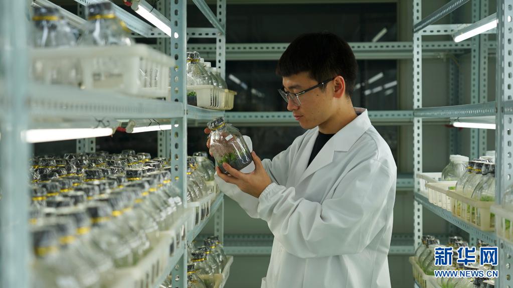 5月7日,在秦嶺花世界現(xiàn)代農(nóng)業(yè)園區(qū),組培研發(fā)中心主任張昌明在查看蝴蝶蘭苗的長(zhǎng)勢(shì)。