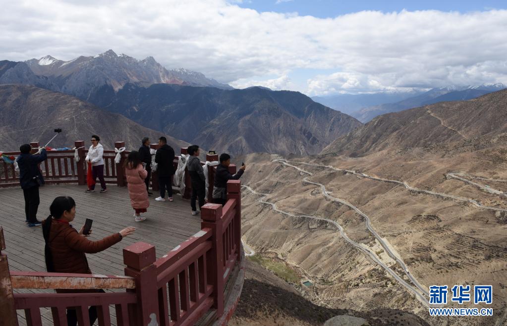 游客在觀景平臺眺望壯觀的怒江72道拐(5月3日攝)。