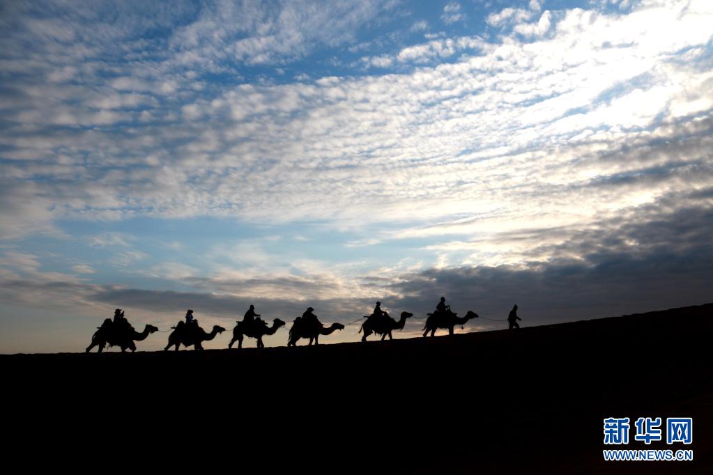5月15日,游客騎駱駝在甘肅省敦煌市鳴沙山月牙泉景區游覽。晨光下,云彩、沙山、駝隊構成了一幅美麗迷人的畫卷。新華社發(張曉亮 攝)